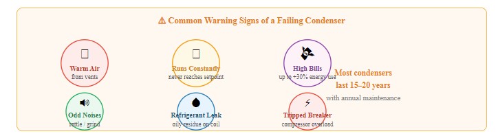 En trasig eller smutsig kondensor försämrar direkt ditt luftkonditioneringssystem prestanda och effektivitet. Håll utkik efter dessa varningsskyltar: